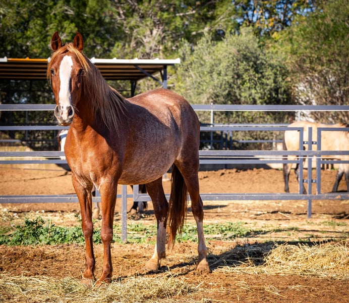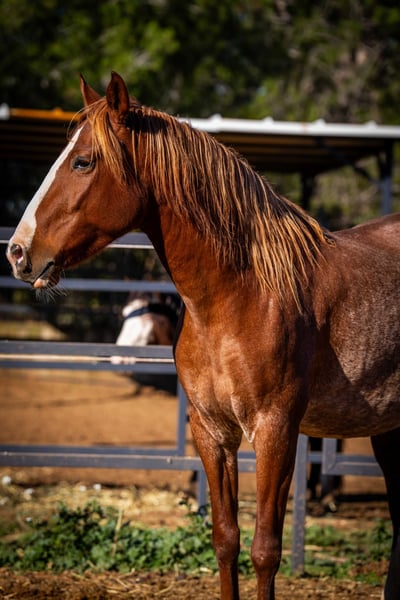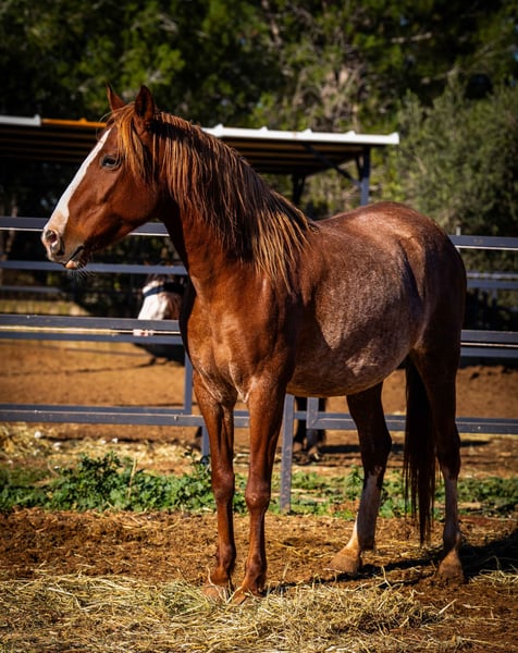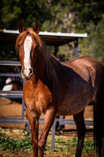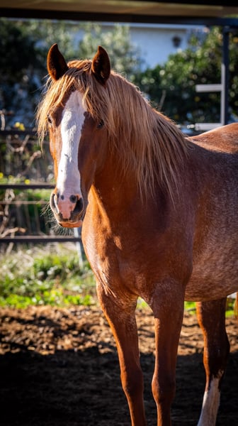 Fleur - our exceptional 4-year-old PRE mare in the rare Rubiacano color - is a true gem for lovers of noble horses. She is expecting her first foal in March/April 2025, which is by an impressive Isabello stallion with a Cartujano bloodline. The sire impresses with his original baroque type and strong mane with a fine head. Fleur herself impresses with her large-framed, stable build, strong pasterns and a wonderfully shaped neck. Her charming blaze and the two white socks on her hind legs also give her an unmistakable look. With her enchanting nature and her people-oriented nature, Fleur is a true lady of the heart who enjoys closeness and contact. Once the foal has been weaned, she can be carefully introduced to training as a riding horse - she has the best prerequisites. An exceptional horse that impresses with its elegance, character and breeding potential!