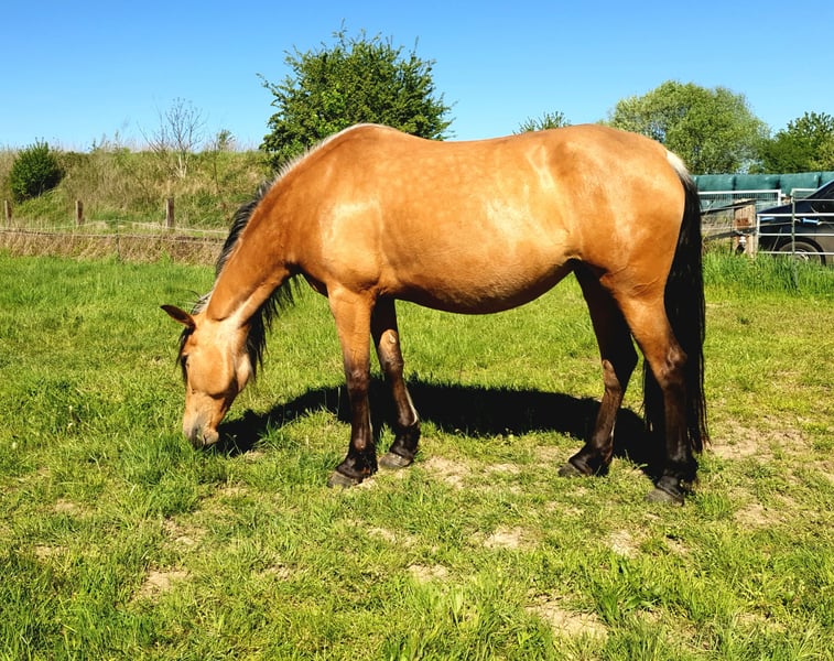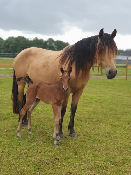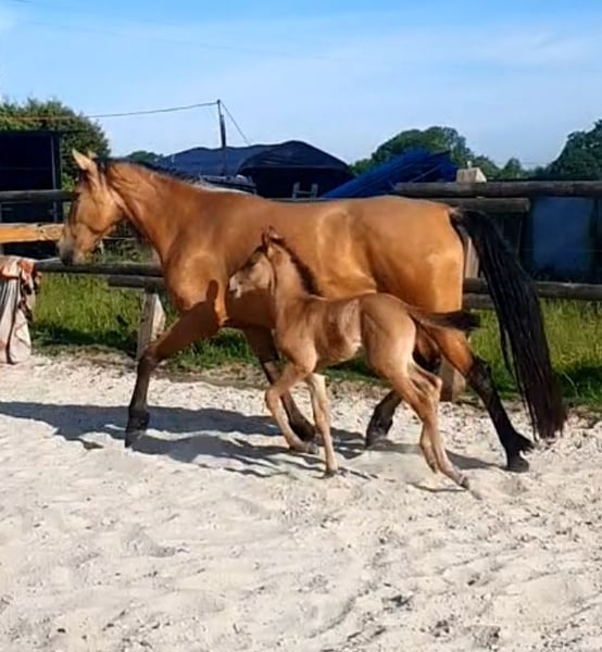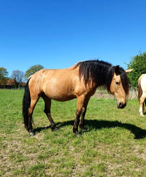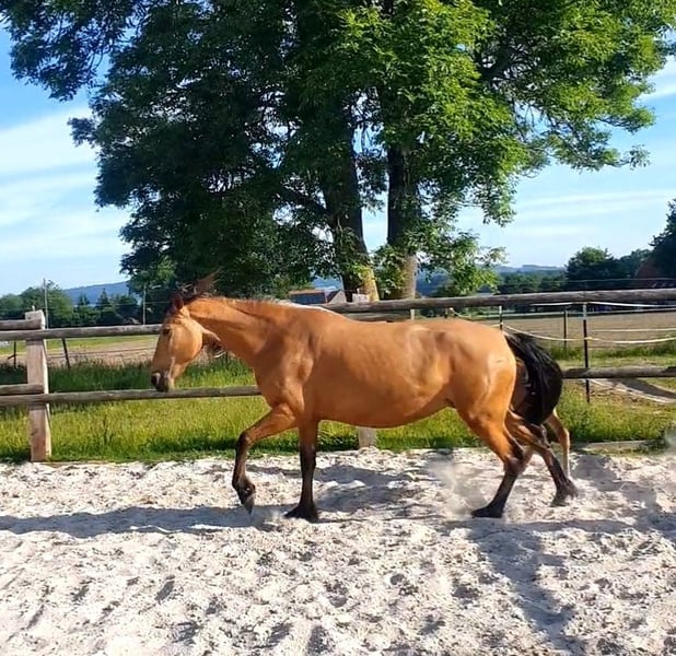 Zum Verkauf steht eine 6-jährige Falbstute mit wahnsinns Behang der Rasse Pura Raza Española, die mit ihrem charmanten Wesen und ihrer vielseitigen Veranlagung begeistert. Mit einem Stockmaß von 1,57 m vereint sie Eleganz und eine kräftige Statur. Diese außergewöhnliche Stute ist fein in der Bodenarbeit und wurde mit drei Jahren sanft angeritten. Sie verfügt über drei raumgreifende, sehr bequeme Grundgangarten. Nach ihrer Ausbildung hat sie erfolgreich zwei Fohlen aufgezogen und sich dabei als tolle und fürsorgliche Mutter erwiesen. Aktuell wird sie, aufgrund der Trächtigkeit, leicht geritten. Das Besondere an ihr Unsere Stute ist nicht nur eine Schönheit, sondern auch eine Bereicherung für jede Herde. Sie ist sozial verträglich und unkompliziert im Umgang. Natürlich super brav beim Schmied und geht problemlos auf den Anhänger. Jetzt kommt der super Bonus: Sie ist tragend von dem Quarter Horse Hengst "Silver Prime" für ein Azteca Fohlen (Papier aus den USA oder Mexico möglich), das Ende April 2026 erwartet wird. Durch die genetische Kombination bestehen nur die beiden Sonderfarben, Silver Bay oder Silver Buckskin. Die letzten Fotos zeigen den Vater des zukünftigen Fohlen Diese Stute ist ideal für Züchter da sie einfach in der Herde ist, tolle Fohlen völlig unkompliziert zur Welt bringt und problemlos aufnimmt.