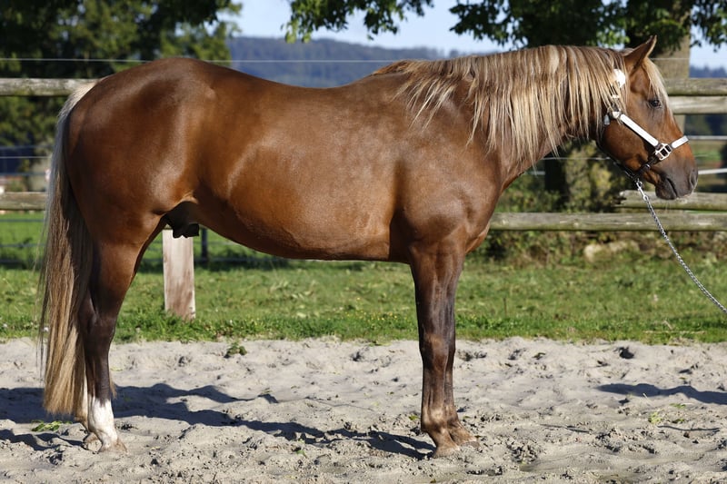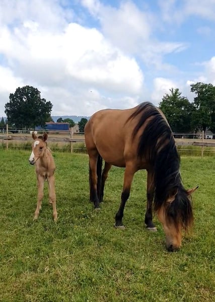 For sale is a 6-year-old chestnut mare of the Pura Raza Española breed, who captivates with her charming personality and versatile abilities. Standing at 1.60 m, she combines elegance with a strong build. This exceptional mare is skilled in groundwork and was gently started under saddle at the age of three. She possesses three spacious and comfortable basic gaits. After her training, she successfully raised two foals and has proven to be a wonderful and caring mother. What makes her special Our mare is not only a beauty but also an asset to any herd. She is sociable and easy to handle. Naturally, she is very well-behaved with the farrier and loads onto the trailer without any issues. Now for the super bonus: She is in foal to the Quarter Horse stallion "Silver Prime" for an Azteca foal (papers from the USA or Mexico possible), expected in May 2026. Due to the genetic combination, only the two special colors, Silver Bay or Silver Buckskin, are possible. The last photos show the father of the future foal. This mare is ideal for breeders as she is easy in the herd, brings foals into the world completely uncomplicated, and accepts them without any problems. The wonderful current Azteca foal is still at her side until the end of October/mid-November, after which she could move out.