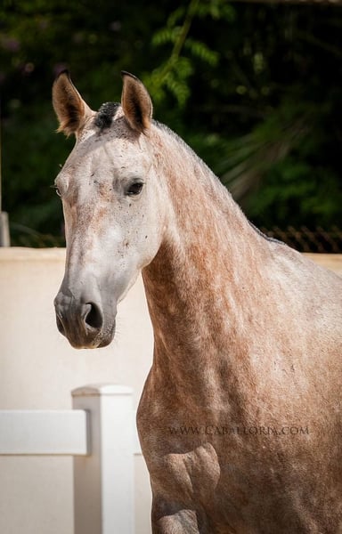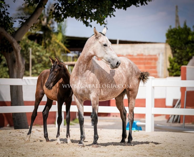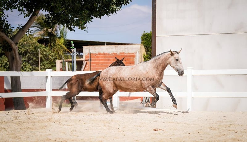 Breeding: We are pleased to introduce you to an impressive PRE red grey mare from the 2019 vintage. With a current height of 164 cm, she impresses not only with her impressive size, but also with her unique genetics. She carries a Pearl Gene, a rare and sought-after color genetics that makes her a real eye-catcher. The mare shows herself in beautiful baroque lines, which are typical for the PRE breed. Her muscular appearance, combined with elegant and expressive movements, make her an ideal choice for growers. Their gaits are fluid and harmonious. For those who are looking for a young horse that is willing to learn and grow with them, we offer the possibility to purchase the mare already ridden for an extra charge. This not only gives you a valuable horse for breeding, but also a horse that has already gained some experience in working under saddle. Finally, we would like to emphasize that this PRE red grey mare not only convinces with her external qualities, but also with her balanced and friendly nature. She is always willing to learn and cooperative, making her a wonderful choice for ambitious breeders as well as lovers of the PRE breed. Take the chance and get to know this gem better. A horse that knows how to convince in every respect with its colouring, its gaits and its character.