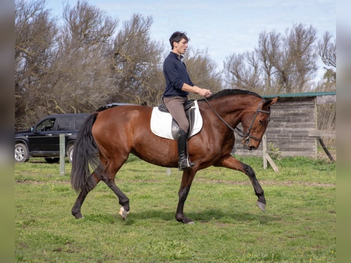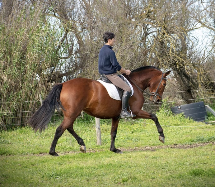 Damisela XIX par Aimar III et Damisela de Lys par Marciano VIII, jument PRE pp de 7 ans. Jument avec beaucoup de chic et de la taille, toise 1m68 Très bons aplombs, très bon dos m, jument porteuse Elle a pouliné l'an passé, très bonne mère, sa pouliche est visible sur place Jument très gentille, montée aux trois allures, elle a été débourrée avant sa mise à la reproduction puis remise en route après le sevrage de sa pouliche. De nouveau au travail, elle se montre très volontaire et très facile, à finir de former. Elle sort seule en extérieur sans problème, jument en avant, pas du tout sur l'œil. Elle serait idéale pour du dressage classique (grosse locomotion).