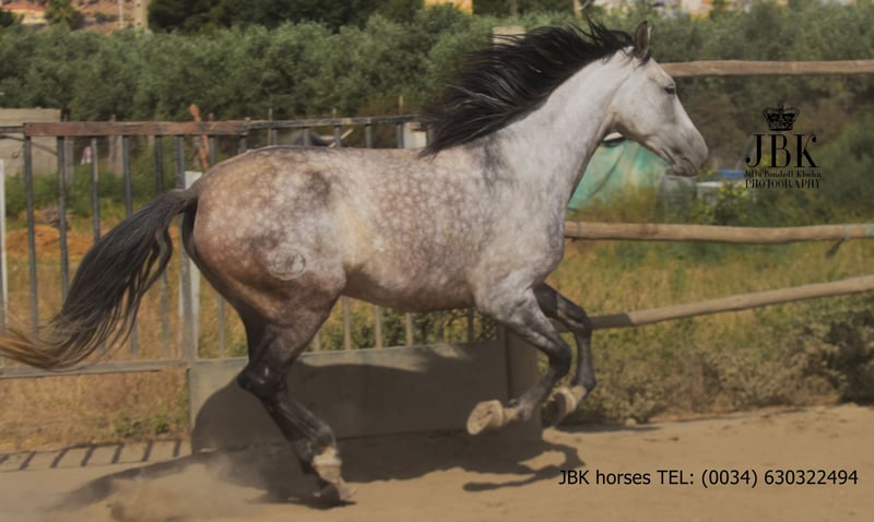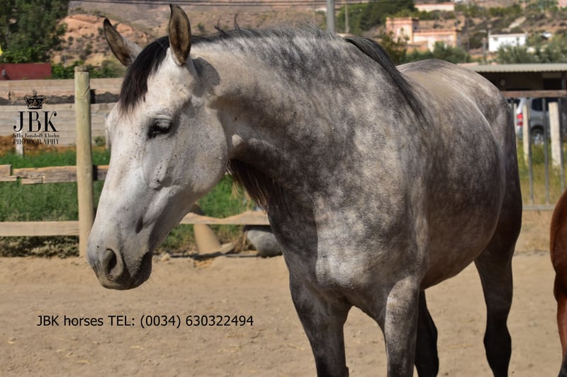 Hier sieht man den Guardiola gezogenen Großvater EDUCADO X aus der Guardiola Zucht sofort. Wer rassekundig ist weiß, dass man es hier mit einem Qualität - Pferd zu tun hat. Eine tolle PRE Stute mit Go und toller Dynamik in der Bewegung und einem sehr freundlichen, ehrlichen Charakter. OPRAH wird sicher später sowohl für die Zucht interessant sein , als auch als Dressur oder Working Equitation Pferd. Sie kommt aus einem friedlichen Zuhause, in dem sie nie Böses erfahren hat. 15.07.2019 geboren , 1, 60 m Stockmaß. Oprah hat derzeit noch ein Fohlen bei Fuss, das aber relativ zeitnah abgesetzt werden kann. Vor ihrer Trächtigkeit wurde sie ebenso angeritten. Melanomfrei !!!!