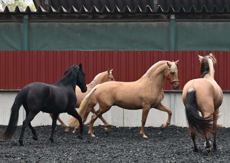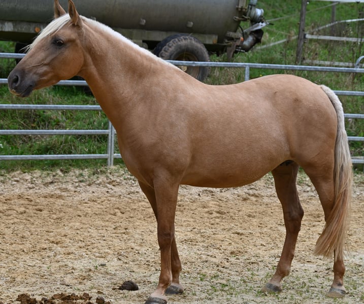 Felina GINES is a stunning Pure Spanish Horse mare in Palomino. She looks like a painting, exuding pride and a regal presence, almost bordering on arrogance. She knows she is beautiful. Felina is 162 cm tall and licensed with ANCCE, with a breeding index of 92.13. Her second foal is on the way, with an estimated due date of February 26, 2026. Felina is intended to give birth to the foal here with us, and after weaning, she can be sold or, upon request, re-bred. I am now listing her so she can be reserved. Being a good mother comes naturally to her, and she successfully conceived on her first attempt this year. She had a foal-free year in 2024 and has been further trained under saddle. Felina is suitable for a rider with 1-3 years of experience; she may initially test a new rider slightly. She is very well-behaved with the farrier and when loading. Overall, she is fearless, uncomplicated, and affectionate. Felina loves being scratched behind the ears. She lives with our herd but is also accustomed to box stall housing. She is quick to learn and content. Felina demonstrates three good and correct gaits, making her suitable for the four-in-hand driving discipline. She is familiar with farm machinery, donkeys, alpacas, dogs, children, and playing kids. Felina is vaccinated and regularly dewormed. Her pedigree includes the well-known REVOLTOSO XXIX, who has so far produced 440 registered offspring. Both her sire and dam lines trace back to Yeguada Militar, renowned for producing very intelligent and healthy horses. Felina has never been ill in our care; she has a scar on one hind leg from an old injury, but it causes no problems.