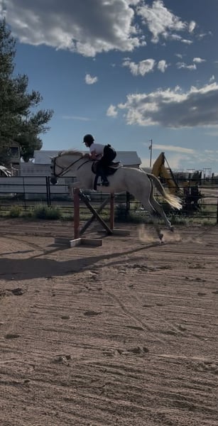 “Goose” Located in Kersey, Colorado Bumpty Bump Bump, “Goose” is out of “Road Ruler” and “Antagoniz’em”. He has been off the track since 2022 and he has had a lot of experiences and fun since then. What he knows: * Jumping, 2’-2’3 comfortably, can jump 3’ with more consistent work * English riding, still learning lead changes but he does have them most of the time * Western riding, he’s comfortable with a western saddle and roping (haven’t roped out of the box yet) * Trail riding, he’s a pretty desensitized boy What is his temperament: * Very loving toward anyone, horses too * Very willing to learn * Doesn’t buck, but if he is getting frustrated learning something new, he will do a small rear (I’m working on cracking that habit and it’s getting better) * He stands very well with the farrier * He loads great, with others and by himself * He absolutely loves water, baths, rivers, puddles, anything * He ground ties, I’ll be working another horse in the arena and I’ll leave him in the middle with his lead over his neck and he won’t move a muscle * If you have him at a trailer and your tacking up, you can leave him untied What do I think he could be: * I think he can definitely show off in the hunter/jumper ring, he is quite athletic * he could also be a sweet intermediate kids horse, I’ve had a 6 year old ride him countless times * He could take someone very far if they’re consistent Why do I need to sell him: * My main riding discipline is western, I love both tho! * I simply do not have the time to be consistent with him and make him what I know he can be * If I could keep him I definitely would! Feel free to email me sromosonneman@gmail.com or call 720-745-2069 with any questions ! Height: 16’2 Weight: 1100 Registered: Yes Registration Association: The jockey club Registration Number: 1423087 Age: 11 Date Foaled: 02/10/2014 Color: Gray Discipline: Jumping Gender: Gelding Is this a rescue?: No