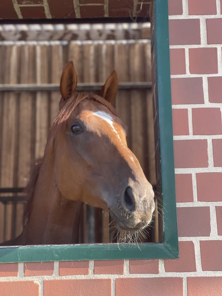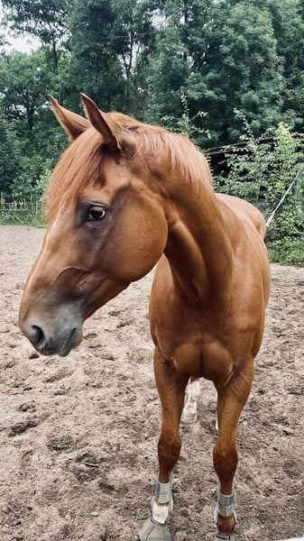 Mo is an absolute dream horse. If I had the time, I would definitely keep him myself. But he deserves a life where he plays the leading role. He ran one race for me and sustained a tendon injury. That was in June. Since then, he has been healing in the pasture with 5 other horses. He has been sound for many weeks now and can be used without hesitation as a leisure horse. He will also be able to do some light jumping, just no high-performance sports anymore. I taught him the basics of a "normal riding horse" when he was just 3 years old. Side passing, collection, backing up, and going forward and downward in self-carriage are second nature to him. I am looking for a lifelong home for him, as he needs a person to bond with and someone who loves him. I will really miss his whinnying every morning. He would go through fire for HIS person and is truly very trainable and eager to learn; he is still a teenager at just 4 years old.
