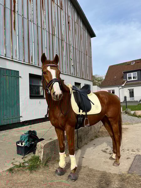 Zum Verkauf steht ein 8-jähriges Englisches Vollblut mit einem Stockmaß von ca. 1,56 m. Er ist ein absoluter Allrounder und eignet sich gut für Kinder oder leichte Reiter, aufgrund seines Alters kann es trotzdem passieren das er seinen neuen Menschen mal testet. Peter ist sehr brav im Umgang, menschenbezogen und zuverlässig. Er zeigt fast nie Unarten und ist sowohl beim Putzen, Führen als auch beim Verladen unkompliziert. Er kennt Boxenhaltung ebenso wie Offenstall und passt sich problemlos an. Im Gelände ist er immer artig und unerschrocken, dies macht er in der Gruppe sowie auch alleine. Peter ist eher einer von der gemütlichen Sorte, es ist eher mal ein englisches Vollblut an ihm vorbei gegangen wie das er selbst eins wäre :) Reiterlich ist er solide ausgebildet und befindet sich auf E Niveau. Dabei ist er stets rittig, ehrlich und macht seinem Reiter Freude. Auch für Freizeitreiter oder als Familienpferd bestens geeignet. Aktuell ist er auf allen vier beschlagen, er kennt es allerdings auch ohne Eisen. Peter hat zudem ein Überbiss was ihn in keiner Weise beeinträchtigt, dies wurde regelmäßig vom Zahnarzt gesehen. Ein liebes, unkompliziertes Pferd, das seinem neuen Besitzer viel Freude bereiten wird. Verkauft wird er nur, da sein aktueller Besitzer den Reitsport aufgibt. Peter kann mit Zubehör verkauft werden. Bei ernsthaftem Interesse freuen wir uns über eine Nachricht. Weitere Informationen und Probereiten nach Absprache möglich.