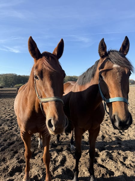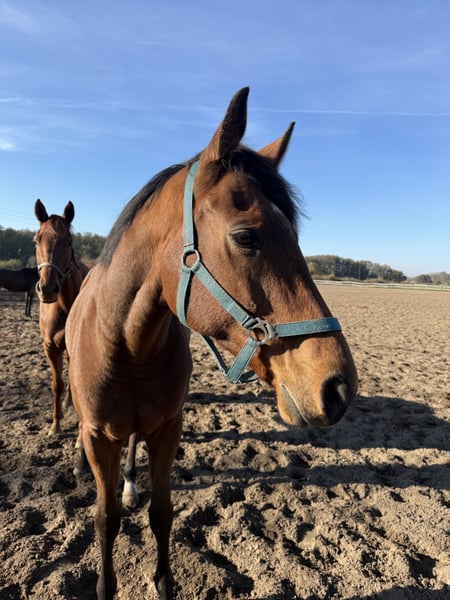Saba is a handsome 16.1 hh chestnut gelding with a refined Thoroughbred build. Born in 2018, he has a very balanced and calm temperament. Saba is turned out part-time in a large, mixed herd in all weather conditions, but he is also used to 24-hour turnout. He is an uncomplicated, brave gelding suitable for young riders and re-entrants. He tolerates rider errors well and is very well-behaved even on the longe. We initially had him barefoot, but he didn't get along well with it, so he now has front shoes again. He has good hooves and is absolutely sound, easy to load and farrier-friendly. A consistently well-behaved leisure horse for everyone. For inquiries or questions, please feel free to contact via WhatsApp or phone call: 0163 3276779.