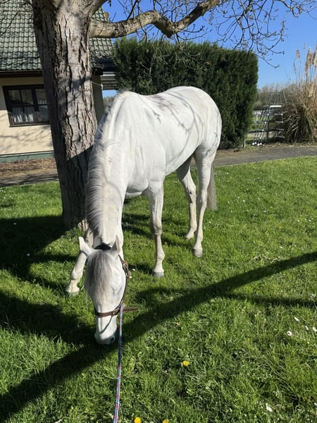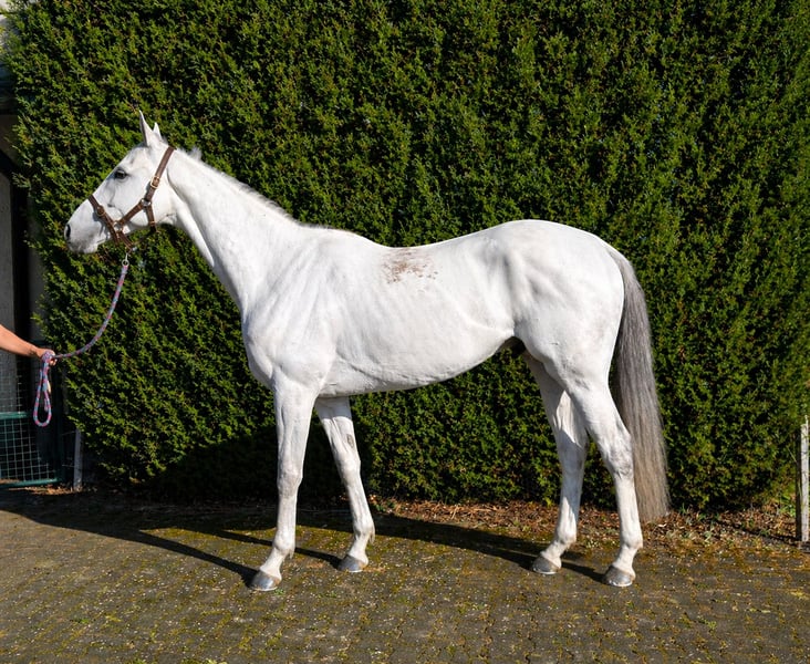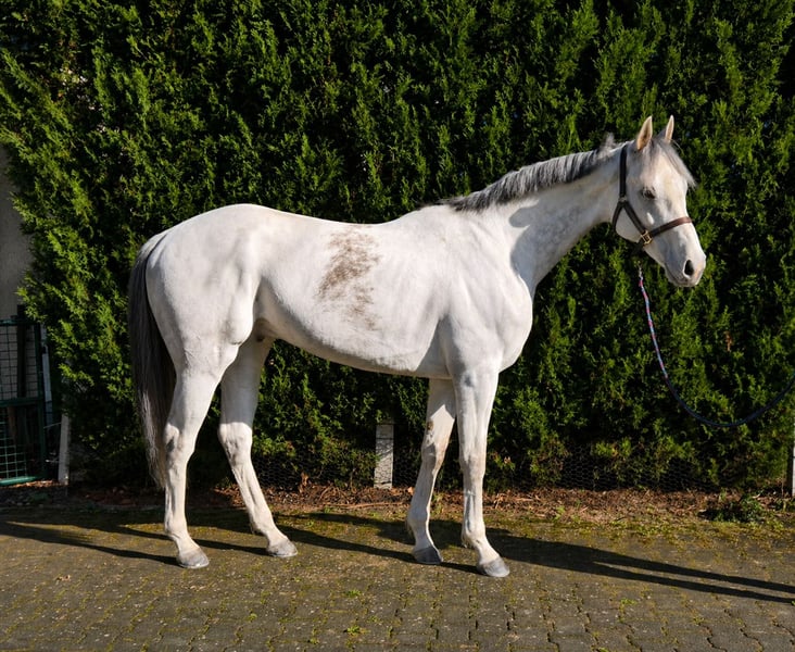 Der schönste Schimmel Deutschlands geht in Rente! Dieser 9 jährige wunderschöne Wallach beendet so langsam seine erfolgreiche Rennkarriere. Unser Udo, wie wir ihn nennen, ist kerngesund und hat den Tierarzt immer nur zum impfen gesehen. Ein eisenhartes Pferd! Im Umgang super lieb und absolut entspannt. Ab und an schaut er mal grimmig, aber er könnte keiner Fliege etwas zu Leide tun. Beim reiten ist er kein Anfängerpferd, da er im Galopp durchaus stark ist. Bocken oder steigen kennt er nicht! Im Gelände absolut nicht guckig, aber auch hier ist er im Galopp noch sehr eifrig. Das wird sich mit der Zeit sicher legen , doch man sollte schon ein erfahrener Reiter sein. Reitplatz kennt Udo ebenfalls schon. Aktuell 4-fach beschlagen, da er bis zu seinem Verkauf noch aktiv Rennen läuft.