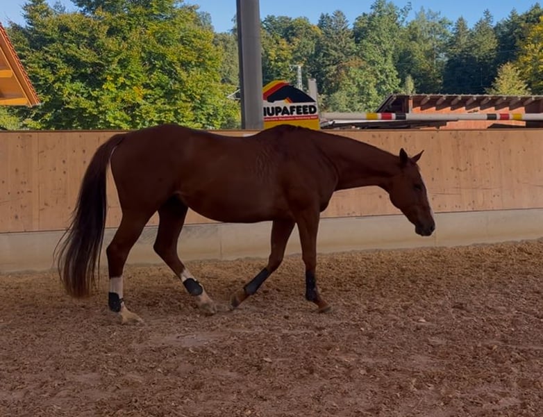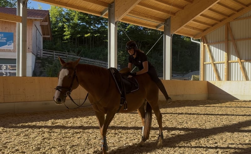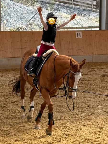 We are seeking a permanent home for our very sensitive 10-year-old mare Betty! She reliably participates in our riding school lessons for beginners, advanced riders, and riding badge courses. She is very ambitious in dressage and jumping and loves trail rides. She has also taken part in Leonhard parades several times. Since she responds very delicately to aids, finding a dedicated rider for her would be ideal to support her further training. She is kept in a mixed herd, with options for box, open stall, or pasture turnout. She has also foaled a beautiful foal by the dressage stallion Rivero. The mare is healthy, regularly checked by the veterinarian, dentist, saddle fitter, and farrier. She is also shoe- and loading-safe. Suitable tack can be purchased together with her. We would be happy to offer an informal riding lesson on Betty to see if she’s the right match.
