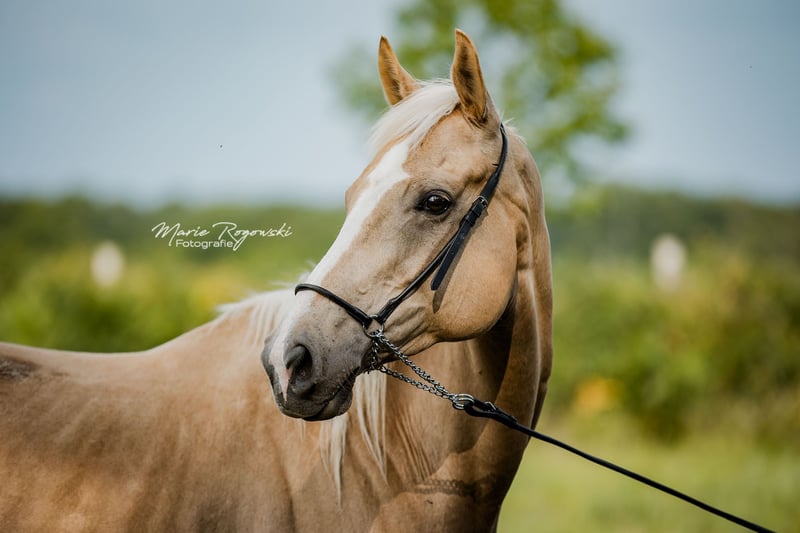 Pur-sang anglais | Palomino (e/e Cr/n) | né en 2018 | environ 160 cm Cette jument pur-sang à la robe rare est issue de la lignée sélectionnée pour sa couleur du haras Falkenhorst. Fille de l'étalon pur-sang palomino Royal Valentine et de la jument dorée Isteni Arany, elle allie un sang sportif à une génétique remarquable. IFIGENIE GF porte le gène Cream simple et présente une morphologie harmonieuse avec un type pur-sang évident. La répartition exacte du composant agouti n'a pas encore fait l'objet de tests génétiques. Elle n'est actuellement pas sous la selle et vit dans un troupeau adapté à son espèce.