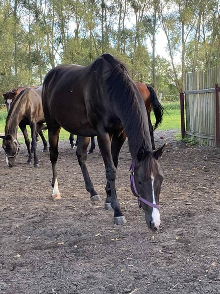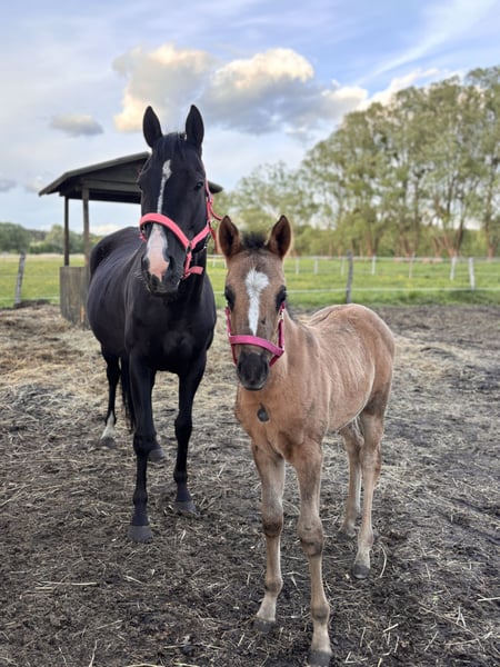 Unridden mare. She is used to leg aids, has been tied up, and walks on a halter. She has not been driven in a trailer. Gaba is a calm and well-balanced horse, raised on pasture within a large herd. She is easy to handle and gets along well with other horses. Good mother. She was measured at 148.5 cm. Possible sale with her foal born in 2025. Foal born in April 2025. A large pony, with a target height of approximately 146/8 cm. Her dam is a full-blooded English Thoroughbred, daughter of the stallion Nowogródek, from a Jape mare. Her sire is Crème Couleur — a descendant of a European Championship medalist. The foal was raised on free-range pasture. Correctly built and well-moving.
