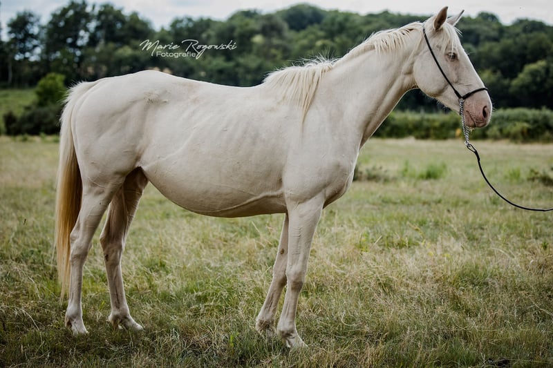 English Thoroughbred | Cremello (e/e Cr/Cr) | born 2016 | 153 cm This exceptionally coloured Thoroughbred mare comes from a specifically selected colour breeding line. Her sire Glitter of Gold and her dam Dressed in Gold belong to a rare bloodline in the Thoroughbred sector in which the double cream gene (Cremello) has been specifically preserved. DRESSED IN CREAM xx is homozygous for the lightening gene and therefore genetically particularly interesting for breeding programmes focusing on colour, noble blood and athletic type. She offers a rare combination of classic Thoroughbred quality and modern genetics. The mare is currently unridden and lives in an open stable in a mixed herd.