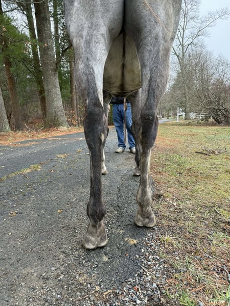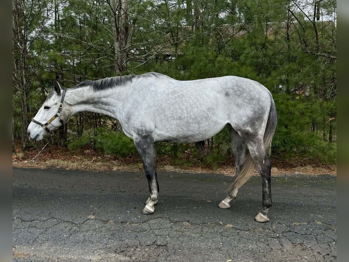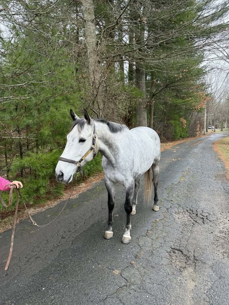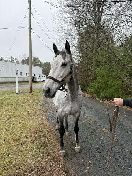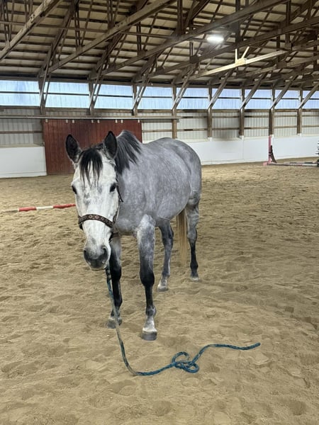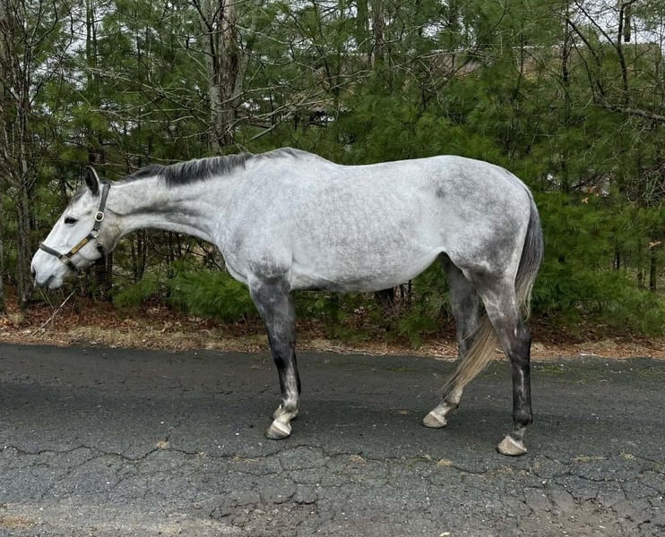 jument de pur-sang gris, exceptionnellement calme et douce, âgée de 9 ans