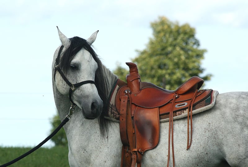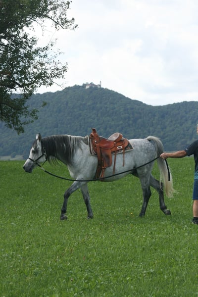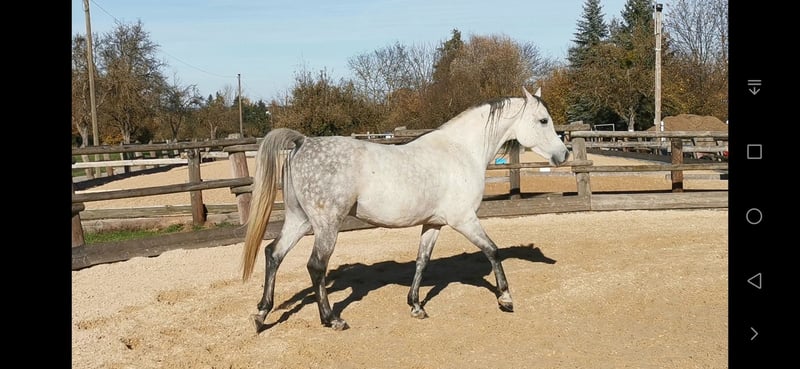 For sale ⚜️ SA Sandro ⚜️ a stunning purebred Spanish Arabian stallion born in 2018. This elegant grey has a height of 15.3 hh and impresses with his graceful appearance and friendly demeanor. He comes from a top-quality breeding program and has been awarded the silver ribbon by VZAP. If you are interested or have any questions, please feel free to contact me at 0175 285 1979. He is accustomed to walking alone, showing courage and confidence when crossing puddles, manhole covers, fluttering ribbons, or plastic sheets. With some training, he can become an excellent leisure partner, but thanks to the silver ribbon awarded by the VZAP association, he is also suitable for breeding. He already has two purebred Spanish foals. Come see him, fall in love, and make him yours!