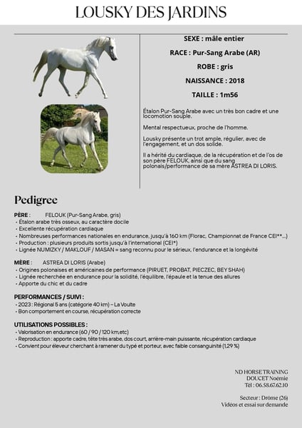 ✨ Lousky des Jardins✨ is available! An elegant and promising horse, ideal for pursuing a career in endurance racing or for breeding. Location: Drôme (26) Strengths: Gait: light, supple, very comfortable Conformation: harmonious, strong frame, ‘green’ horse in work (potential to be moulded) Exceptional origins: Sire: FELOUK (Maklouf / Masan) – approx. 50 offspring with performances up to high level (CEI*)** Dam: Astrea di Loris (ITA) – PIRUET origins Qualification: 40 km validated Who is he for? Riders looking for a well-bred horse to develop for sport or an interesting profile for a breeding programme (pedigree, model and locomotion all present). Price: on reasonable offer 📸 Additional photos & videos on request (PM). 👉 Contact me via private message for more information, videos and trial arrangements. Translated with DeepL.com (free version)