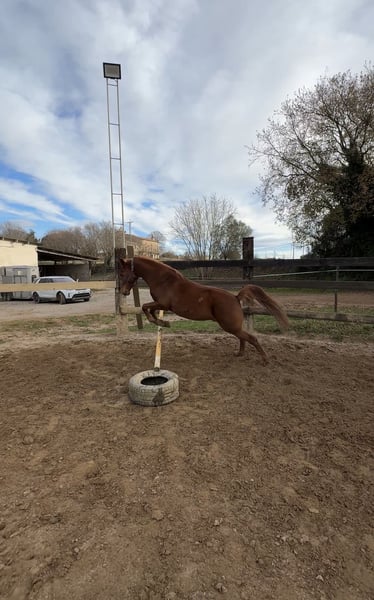 10-year-old chestnut gelding pony with an exceptional and noble temperament. He has excellent aptitudes for jumping, leisure riding, lessons, and trail riding. Capable of navigating small courses and suitable for riders of all levels. He also has experience in schooling sessions for training, as well as guided trail rides or group lessons.