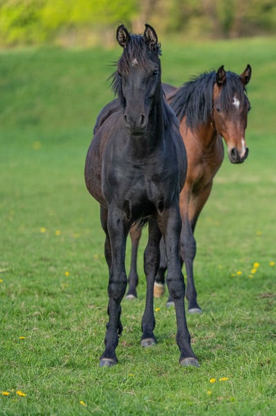 Typey and extremely correct young purebred Arabian stallion in a black jacket. Kadri has only a small flock on his forehead, otherwise without markings. He is curious without being pushy, fearless, people-oriented and has a friendly character. He grows up with other mares and foals and is excellently socialized. He has already learned the basics of foal training, i.e. touching everywhere, haltering, lifting legs, etc. It goes without saying that our foals are wormed regularly, are already microchipped and receive a pedigree certificate and an equine passport. If desired, he can continue to be raised by us or move to a new home from around October. Kadri would be delighted to receive a visit. Please contact us.