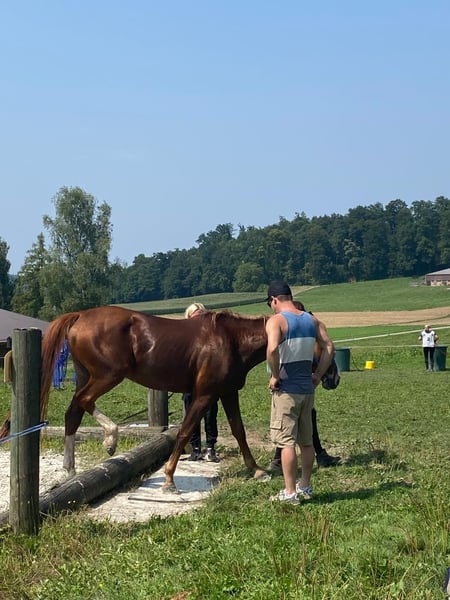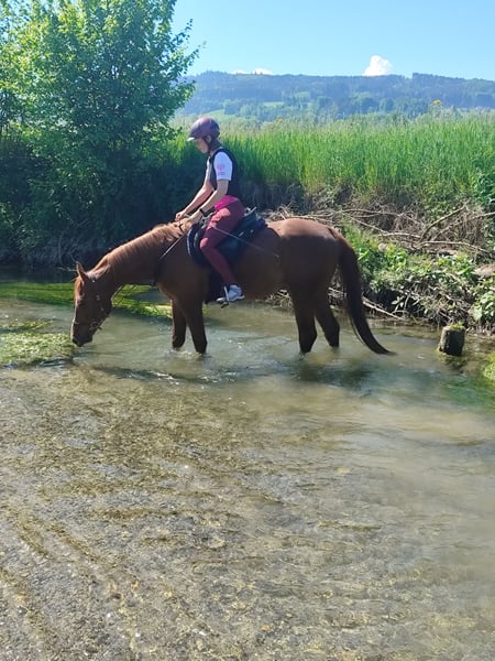 Super schöner kompakt, kräftig gebauter 6 jähriger Vollblutaraber mit einem Stockmass von 1.60 sucht den besten Platz. Er hat eine äusserst starke Hinterhand und läuft von sich aus in einer schönen Anlehnung. Er macht richtig Spass daher bei der Hallenarbeit. Er wurde vielseitig eingesetzt viel in Gelände mit auch drei Distanzritte, schwimmen im See, Gymnastik Cavelletikurs, Hallenarbeit, Longenarbeit am Kappzaum. Er hat ein ruhiges Gemüt. Er ist absolut verkehrssicher, ob Lastwagen, Traktoren oder ein Zug direkt an ihm vorbei fährt, macht ihm nichts. In den Anhänger steigt er gerne problemlos ein. Er lebt in einer Gruppe mit einem Wallach und einer Stute was ihm super gefällt. Er ist total unkompliziert im zusammen leben mit anderen Pferden. Momentan läuft er barhuf oder mit Klebebeschlag. Er ist ein richtiger Sonnenschein, welcher für jeden Spass zu haben ist. Und für seine Leckerlis alles macht. Dabei lernt er sehr schnell Neues, da er sehr clever ist. Aus Zeitmangel in letzter Zeit weniger häufig geritten.