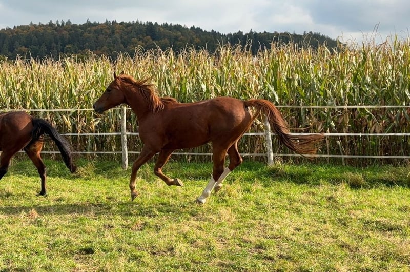 Super beautiful compact, strongly built 6-year-old Thoroughbred Arabian with a height of 1.60m is looking for the best home. He has an extremely strong hindquarters and naturally moves in a nice connection. He is a lot of fun during arena work. He has been used in various disciplines, including a lot of trail riding, three endurance rides, swimming in the lake, gymnastics cavaletti courses, arena work, and lunging in a side reins. He has a calm temperament. He is absolutely traffic-safe, whether trucks, tractors, or a train pass directly by him, it doesn't bother him at all. He loads into the trailer easily and without any issues. He lives in a group with a gelding and a mare, which he really enjoys. He is totally uncomplicated in living with other horses. Since companionship is very important to him, it is my concern that he continues to have this. At the moment, he is barefoot or with glue-on shoes. He is a real ray of sunshine, always up for fun. He will do anything for his treats. He learns new things very quickly, as he is very clever.