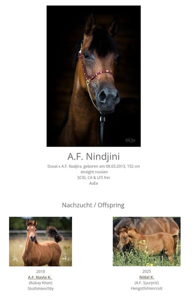 Fulfill your dream of owning a foal? We make it possible, as this year we are offering several of our mares – all in excellent condition! Pure Russian bloodlines of the highest quality, with substance, movement, and type! You can find more information about the mares in the photos and at www.kanbur-arabians.at/verkauf-sale.