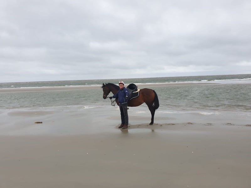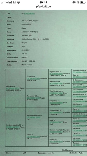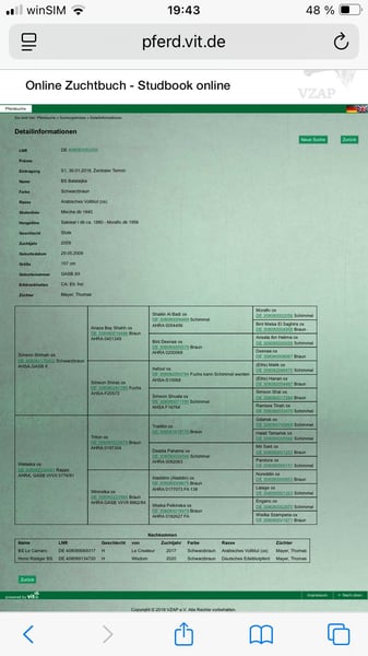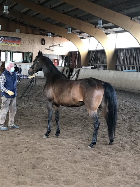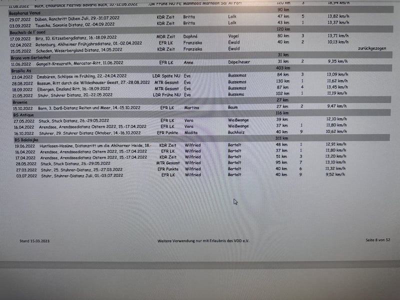 Zum Winterpreis und damit sie rechtzeitig vor dem abfohlen in ihrem neuen Zuhause heimisch werden kann BS Balalijka ist eine dunkelbraune Araberstute, geb 2009 Sie ist gedeckt vom Asil Ägyptischen Rapphengst BS Echnaton für 2026. 2 weibliche Nachkommen von Echnaton aus diesem Jahr können im Gestüt angeschaut werden. Ein 3 Jöhriger Rapphengst vom Gestüt wird gerade problemlos und schonend angeritten, der 5 Jöhrige Sohn läuft seine erste Distanzsaison und ist zur Körung zugelassen Balalijka hatte bereits 2 Fohlen. Eines davon von einem Hannoveraner Hengst aus der Weltmeyer Linie Nach ihren 2 ten Fohlen wurde sie auf den Distanzsport vorbereitet und hat ab der Saison 20/21 ihren Ü60 Distanzeinsteiger in den Sport begleitet. Dabei deckt sie mit ihrer kräftigen Statur ihren Reiter mit über 1,80m gut ab. Der Weg ging für beide bis zum mittleren MTR über 93 km ohne Ausfälle. Auffällig sind ihre guten Pulswerte und schnelle Regeneration. Jeden Pulsritt hat sie in den Top 3 beendet Im Juli 22 war sie lahm und wurde in der Klinik vorgestellt. Es wurde ein Chip gefunden und entfernt. Danach wurde sie in Ruhe wieder antrainiert. Eine erneute Lahmheit ist nicht aufgetreten, alle Scheckkarten seit dem sauber 2024 und 2025 hat sie 2 Jugendlichen Reitern einen Start in den Sport ermöglicht. Balalijka zeigt sich dabei kinderfreundlich. 2025 hat sie mit ihrer Reiterin am Jugendcamp teilgenommen Balalijkas weiter weg kann vielseitig sein. Ob er in der Zucht weitergeht, Freizeit oder Sport oder Lehrpferd wird ist offen Aktuell wird sie geritten und kann bei Interesse Probegeritten werden.
