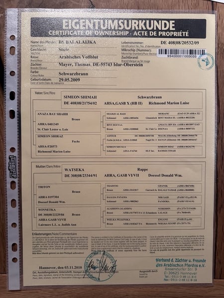Por precio de invierno y para que pueda adaptarse a su nuevo hogar antes del nacimiento de su potro, BS Balalijka es una yegua árabe de color castaño oscuro, nacida en 2009. Está cubierta por el semental árabe egipcio de línea asil, BS Echnaton, para la temporada 2026. Se pueden visitar dos hijas de Echnaton nacidas este año en la finca. Un potro árabe de 3 años, de línea Rapp, ya está siendo montado de manera sencilla y sin problemas, y un hijo de 5 años, también de línea Rapp, está iniciando su primera temporada en pruebas de resistencia y ha sido aprobado para la selección de sementales. Balalijka ya ha tenido dos potros, uno de ellos por un semental Hannoveriano de la línea Weltmeyer. Tras su segundo potro, fue preparada para las pruebas de resistencia y, desde la temporada 20/21, ha acompañado a su jinete en competiciones de más de 93 km sin fallos. Destacan sus buenos valores de pulso y su rápida recuperación. En cada prueba de resistencia, ha terminado en el top 3. En julio de 2022, sufrió una cojera y fue llevada a la clínica, donde se encontró y extrajo un chip. Después, fue entrenada nuevamente con calma. No ha vuelto a presentar cojera y todos los chequeos posteriores han sido normales. En 2024 y 2025, ha permitido que dos jinetes jóvenes compitan en pruebas de resistencia. Balalijka demuestra ser amigable con los niños. En 2025, participó con su jinete en un campamento juvenil. El potencial de Balalijka es versátil. Puede continuar en la cría, dedicarse a la recreación, al deporte o convertirse en caballo de enseñanza, según lo que se decida. Actualmente, está en uso y puede ser probada en montas por interés.