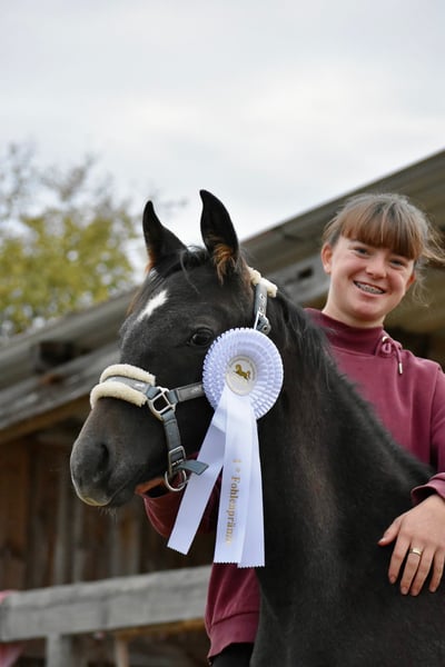 Maysouna von Hohenholz - eine ganz besondere Tochter von VAG Elea und Mefisto Sie stammt aus der starken seltenen Mutterlinie der Manda. Eine menschenfreundliche, Reit- und Leistungskinie aus urpolinschen u Altdeutschen Linien. Mefisto - ihr Vater - ein leistungsgeprüfter und absolut braver Hengst. Im Trab und im Galopp glänzte er je mit einer 9,0 als Wertnote! HLP über Rennen mit 85GAG Er lief bis CEI**120km erfolgreich und war BaWü Meister. Er überzeugt durch überdurchschnittliche Grundgangarten und super Reitpferdeexterieur Ihre Mutter Elea steht seit 1,5 Jahren bei uns auf dem Hof. Viele Pferde aus dieser Linie sind erfolgreich im Distanzsport. Unter anderen lief der Vollbruder von Eleas Mutter CEI 160km, der Halbbruder CEI 160km sowie der WM Teilnahme. Eleas Mutter lief bis 80km erfolgreich bevor sie in die Zucht ging. Die Stute hat einen liebenswerten Charakter und ist für Alles zu haben. Ob Ponyreiten mit kleinen Kindern, GHT, oder entschlossen und sehr leistungsbereit im Distanztraining. Sehr menschenbezogen ist sie der Liebling vieler am Hof. Im Mai erblicke Maysouna das Licht der Welt und wächst seitdem ua mit Gleichaltrigen auf. Im großzügigen Offenstall mit angrenzenden Weiden genießt sie Ihre Kinderstube. Da bei uns immer Aktion ist am Hof, kennt sie das rege Hofleben mit Traktor, vielen Kindern, Eseln, Ziege, Hunde anderen Tieren und Landmaschinen. Maysouna ist halfterführig, anständig beim Hufe machen und kennt auch schon Hänger fahren. Aufgeschlossen und Neugierig erkundet sie täglich die Welt. Maysouna wurde bei der Musterung von der Kommision mit zweimal sehr gut prämiert. Wir wünschen uns einen artgerechten Platz wo sie mit gleichaltrigen aufwachsen kann.