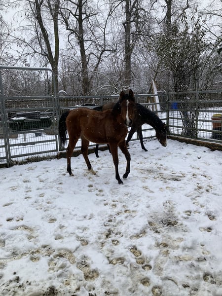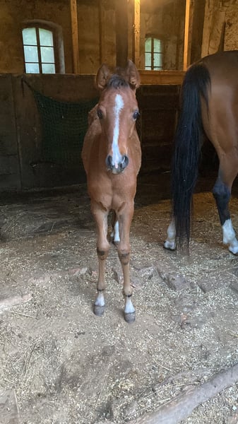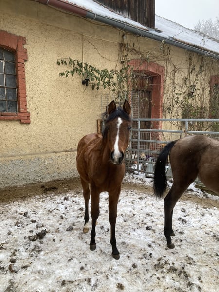 Aus privaten Gründen muss ich mich leider von meiner selbstgezogenen Jungstute trennen. Ellie wurde letztes Jahr (03/2025) bei mir geboren, geht brav am Halfter und gibt schon brav Hufe. Sie ist auch schon brav beim Schmied. Ellie ist aufgrund ihrer Abstammung sowohl für die Zucht, den Sport als auch für die Freizeit interessant. Ellie besitzt wunderbare, elastisch-weiche Gänge, welche jetzt schon auf ein tolles und komfortables Reitpferd hindeuten!! Sie kann natürlich auch weiterhin zur Aufzucht da bleiben, steht mit einer gleichaltrigen Stute gemeinsam über Nacht zusammen, tagsüber dann draußen, kennt daher Koppel und Box. Ist im Herdenverband aufgewachsen. Geimpft, gechippt und regelmäßig entwurmt! Preis ist VHB. Ansehen lohnt sich! Transport möglich. Bitte anrufen oder per WhatsApp anfragen :)