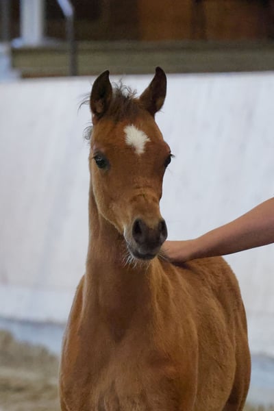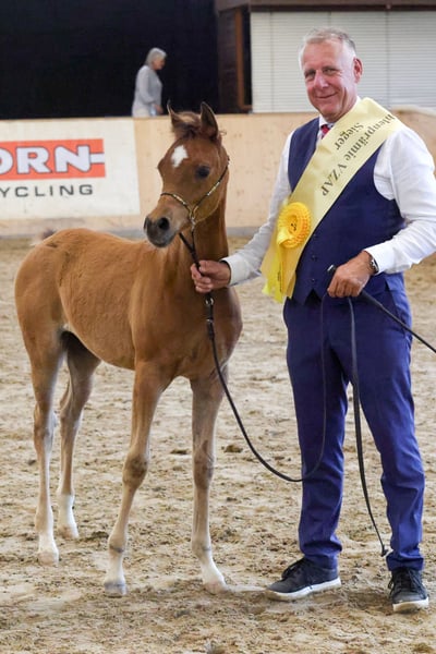 Bel Malinee (*03/2025) Eerste plaats bij de merrieveulens en winnaar van alle veulens tijdens de keuring van de VZAP Veelzijdig inzetbaar voor de toekomst: ze heeft enorm veel potentieel voor de fokkerij, en is ook geschikt voor shows of sport dankzij haar springerige en uitgestrekte bewegingen. Ze is regelmatig ontwormd en gevaccineerd, halstert gemakkelijk op leeftijd en kent de hoefsmid. Ze staat momenteel in een open stal en heeft haar volle wintervacht. Bezichtiging is op elk moment mogelijk. Moeder is een zeldzame schimmelmerrie van Ajman Moniscione met krachtige, vliegende bewegingen, afkomstig uit de Poolse moederlijn, die ze heeft doorgegeven aan haar dochter. Stamboom: https://www.allbreedpedigree.com/bel+malinee