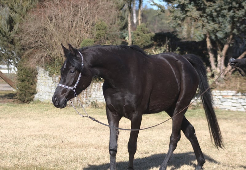 Hermosa yegua de 4 años, de color negro y con homocigosidad por ascendencia, en busca de un nuevo hogar. Cuerpo sólido y correcto, movimientos excepcionales. Es muy alta, se estima una altura final de aproximadamente 1.60 m, actualmente mide ya 1.58 m (última foto). Cara bonita, cuello largo y elegante, patas y cascos correctos. Casi sin blancas, cuerpo y patas completamente negros, solo una pequeña estrella en la frente. Pedigrí interesante: Línea paterna: Kuhailan Afas o.ar. 1930, importado en 1931 a Gumniska (PL) Línea materna: Abeyah o.ar. 1896, importado en 1906 a H. Davenport (US) En su pedigrí se pueden encontrar nombres famosos como Hafati Vogue, Simeon Shai, The Desperado, Ali Jamaal, Bei Shah, Alegro, Probat y otros. Actitud llamativa y segura. Perfecta para reproducción, exhibiciones o para endurance y paseo, ya que posee una de las mejores líneas de sangre en endurance (Wagram****). Registrada en PASB. Lista para la temporada de cría. Precio en el rango superior. WhatsApp +48 513 179 245