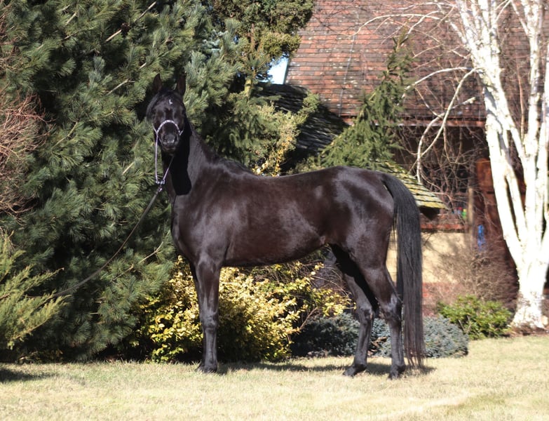 Beautiful 4 yo. mare, black homozygous by parentage looking for a new home. Correct solid body, Super movements. She is very tall, estimate final height 160 cm, currently she is already solid 158 cm (last picture) ! Nice face, beautiful long neck, Correct legs and hoofs. Almost no white at all , all black body and legs only a small star. Interesting pedigree Sire line: Kuhailan Afas or.ar. 1930, imp. 1931 Gumniska (PL) Dam line: Abeyah or.ar. 1896, imp. 1906 H. Davenport (US) In pedigree can find famous Hafati Vogue, Simeon Shai, The Desperado, Ali Jamaal , Bei Shah, Alegro, Probat and more... Showy atittude . Perfect for breeding, show or for endurance/riding - she carries one of the best endurance bloodlines ever (Wagram****) Registered in PASB. Ready for breeding season. Higher price range. WhatsApp + 48 513 179 245