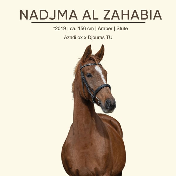 NADJMA AL ZAHABIA XX stammt von Azadi ox aus der Nadjma De Majorie ox und bringt frisches arabisches Blut in unsere sonst rein trakehnergeprägte Zucht. Als echte Tochter des Rennaraber-Vererbers Azadi überzeugt sie mit Energie, Leichtfüßigkeit und einem guten Fundament – gepaart mit der typischen Ausstrahlung und Sensibilität ihrer Linie NADJMA AL ZAHABIA XX ist bereits angeritten und zeigte sich dabei stets brav, aufmerksam und rittig. Aufgrund zeitlicher Kapazitäten wird sie aktuell jedoch nicht weiter gearbeitet. Im täglichen Umgang zeigt sie sich freundlich, menschenbezogen und aufmerksam – ein echtes Herzenspferd mit Charakter, das sofort begeistert.