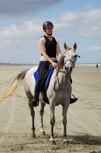 Piękna klacz z 2017 roku, ma 8 lat. Bardzo ładna i solidnie zbudowana klacz. Nie dałoby się tego poznać, że ma tylko 1,50 m wzrostu, ale dzięki jej mocnej budowie wygląda też dobrze pod wyższym jeźdźcem. Przede wszystkim jeździ się ją na zewnątrz, co jest jej ulubioną formą aktywności. Zarówno solo, jak i w grupie, zachowuje się równie dobrze. Potrafi łatwo odciągnąć głowę, ale równie chętnie zostaje w tyle. Braliśmy ją na wiele wypraw, wielodniowych rajdów po całej Belgii (las, plaża itp.). Uczestniczyła także w kilku wyścigach endurance do 60 km. Wszystko to jeździmy bezstresowo na ogłowiu z halterem, ponieważ nie lubi dużego nacisku na pysk. Jest łatwa w kierowaniu i zatrzymywaniu. Ma trzy bardzo przyjemne chody. Potrafi dawkować swoją energię i ma dobrą wytrzymałość na długie przejażdżki. Nie ma nerwowego ani szalonego charakteru, emanuje spokojem. Uważamy, że najbardziej nadaje się na rajdy długodystansowe i mniejsze zawody endurance. Posiada również podstawy pracy na ziemi / Parelli. Podczas wyjazdów w teren czasami skacze przez przewrócone drzewo. Ostrożna, spokojna klacz w obsłudze, łatwa w transporcie i na nieznanym terenie. Łagodna w stadzie. Płynnie zatrzymuje się, gdy wsiadasz. Również łatwo wsiada na przyczepę. Poszukujemy osoby z doświadczeniem w horsemanship. Nie musisz być top jeźdźcem. Klacz może być poddana badaniu weterynaryjnemu, do tej pory nie miała żadnych problemów. Aktualne szczepienia. Kilka razy odrobaczana. Wszystkie kopyta w porządku. Ma rodowód arabski (sport, długie dystanse), import z Francji. Może również kontynuować hodowlę.