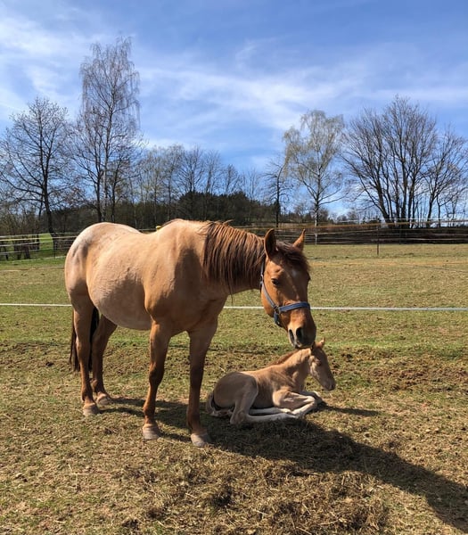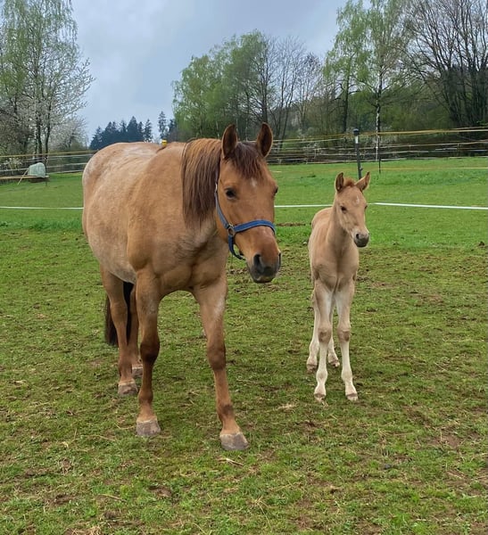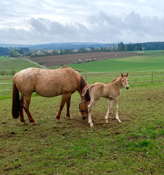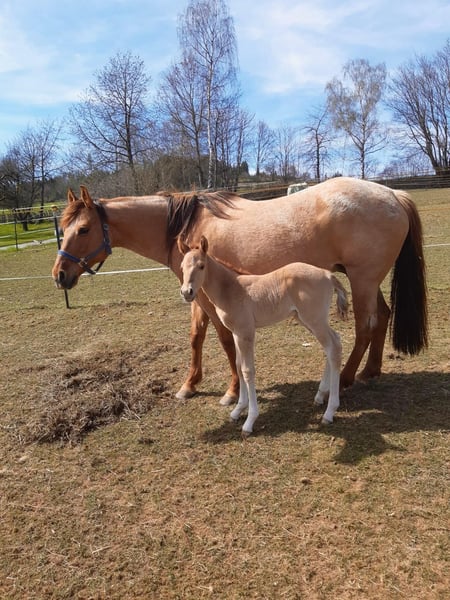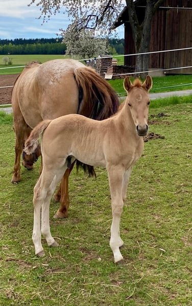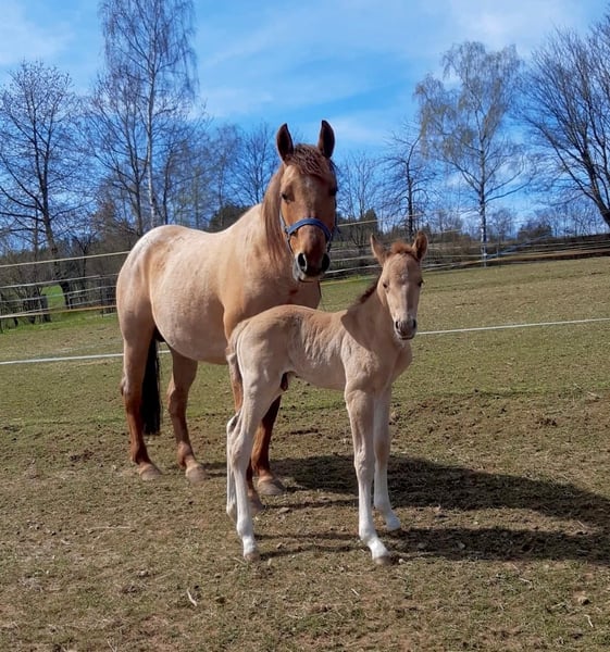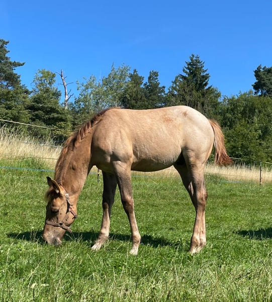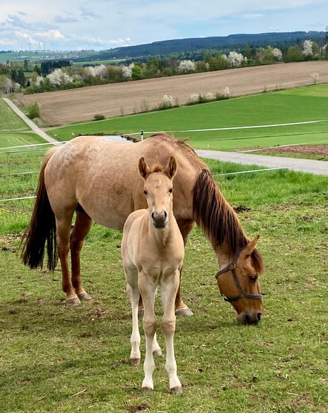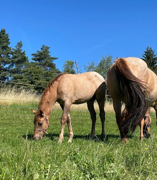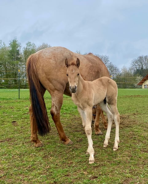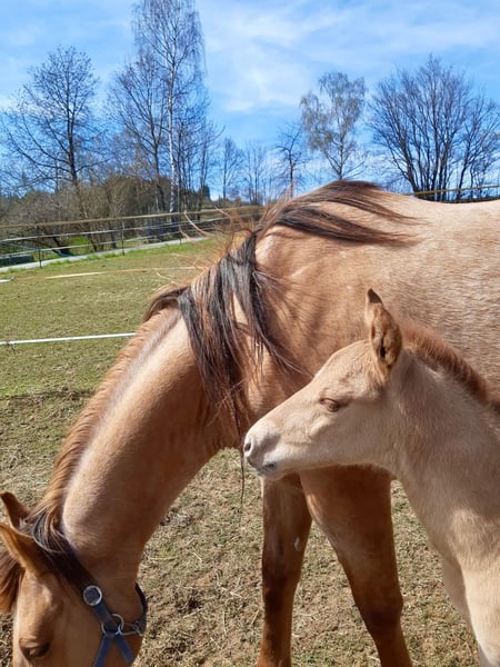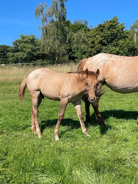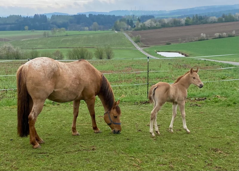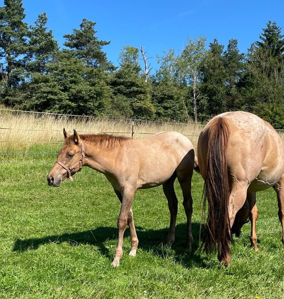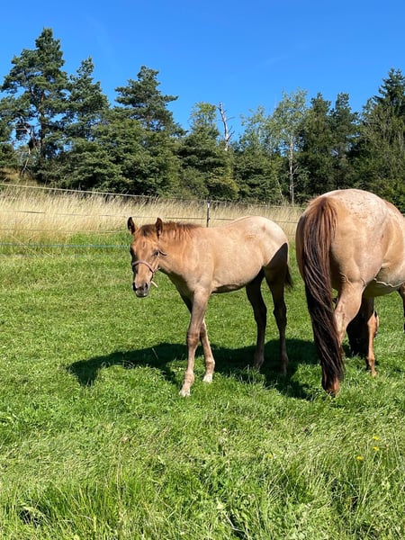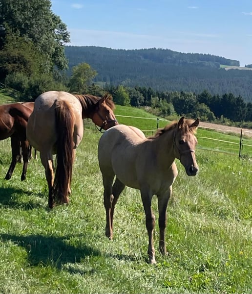 Ein kleiner Herzensdieb auf vier Beinen! - Geboren am 09.04.2025 - Vom ersten Moment an zeigt er, was in ihm steckt: neugierig, mutig und voller Lebensfreude entdeckt er Schritt für Schritt seine Welt. Ob beim Toben auf der Koppel oder beim Kuscheln an Mamas Seite – er hat einfach das gewisse Etwas, das Herzen berührt. Er bringt nicht nur Charme und Ausdruck mit, sondern auch ein ausgeglichenes Wesen, das jetzt schon begeistert. Er wird voraussichtlich ein handliches Endmaß von ca. 148 cm erreichen – perfekt für Sport und Freizeit! Er ist kräftig gebaut, mit geraden, stabilen Beinen und harmonischen Proportionen – ein echter Hingucker mit viel Potenzial. Er ist kerngesund, genetisch 5-Panel n/n getestet und kennt bei Abgabe bereits den Tierarzt und den Hufschmied. Natürlich wird er regelmäßig entwurmt und altersgerecht geimpft. Er wächst liebevoll im Herdenverband mit Gleichaltrigen auf und zeigt sich dort neugierig, menschenbezogen und verschmust. Der Kleine ist sehr brav im Umgang, lässt sich problemlos händeln und bewegt sich locker und elegant – ein echtes Naturtalent! Dank seiner hervorragenden Reining-Abstammung bringt er beste Voraussetzungen für den Turniersport mit, ist aber genauso ein Schatz für den Freizeitreiter. Sein Papa ist kein Geringerer als der erfolgreiche Lil Dunit Smart (LTE NRHA USA 33.560 $, NRHA Germany 10.180 €), ein Sohn des bekannten Lil Peppy Dunit Right. Er wird mit vollständigen Papieren und Equidenpass abgegeben – bereit, die Herzen seiner neuen Menschen im Sturm zu erobern. Er sucht noch sein⭐️⭐️⭐️⭐️⭐️-Zuhause! Bei Interesse gerne melden!
