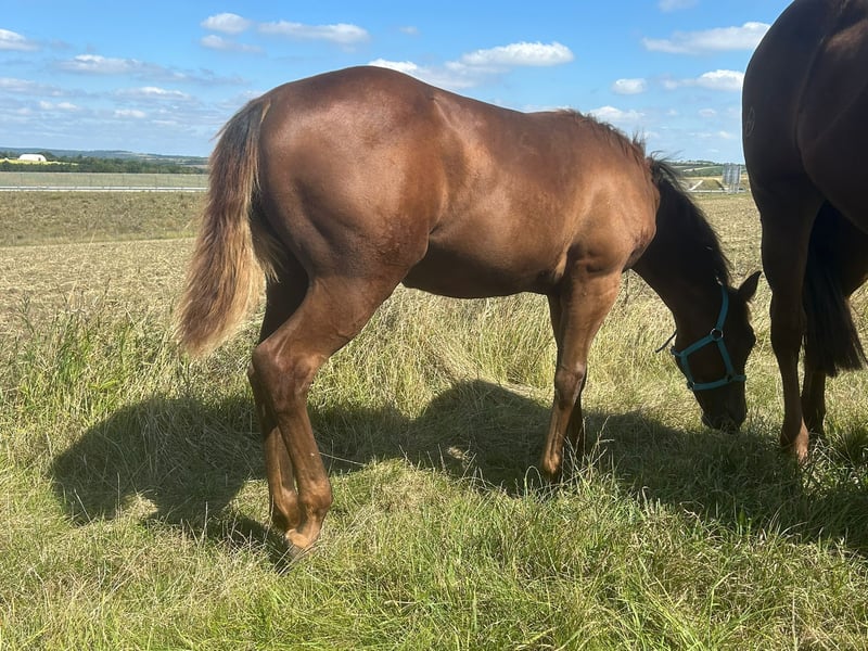 Verkaufe American Quarter Horse Hengst – Dunkelfuchs, Geburtsjahr 2025 Zum Verkauf steht ein vielversprechender American Quarter Horse Hengst, geboren im Jahr 2025. Der kleine Ferdinand präsentiert sich in einem eleganten Dunkelfuchs-Farbton und wird ein geschätzes Stockmaß von ca. 150 cm erreichen. Er hat ein tolles Fundament und ein ausgezeichnetes Wesen, er ist einfach im Umgang und will immer gefallen. Der Hengst zeigt jetzt schon gute Ansätze im Bereich Reining. Ferdinand hat ein sehr aufgeschlossenes freundliches Wesen und lernt sehr schnell. Er ist im Umgang sehr brav. Ferdinand wächst artgerecht im Herdenverband auf und ist sehr sozial. Bei Interesse oder weiteren Fragen stehe ich gerne zur Verfügung. Besichtigungen sind nach Vereinbarung möglich. Bei erstgemeinten Interesse kann über den Preis geredet werden. Wichtig ist mir ein guter artgerechter Platz und ein liebevoller Umgang.