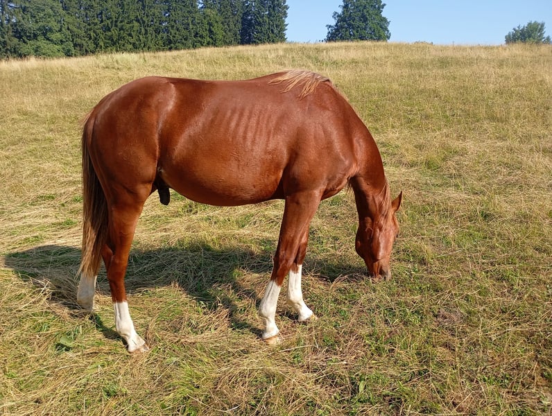 QH stallion born 13.04.24, 6 panel N/N via the parents, sorrel, "Murphy" is a very curious, people-oriented and fearless little stallion, he grows up with us in a species-appropriate manner in the herd on large pastures. He will be sold in the fall after weaning, of course with AQHA paper and equine passport, he can also stay with us for further breeding by arrangement, NRHA Germany and Euro will be paid. Due to his pedigree he is very interesting not only for reining but also for cowhorse. Further information by phone