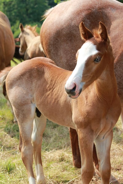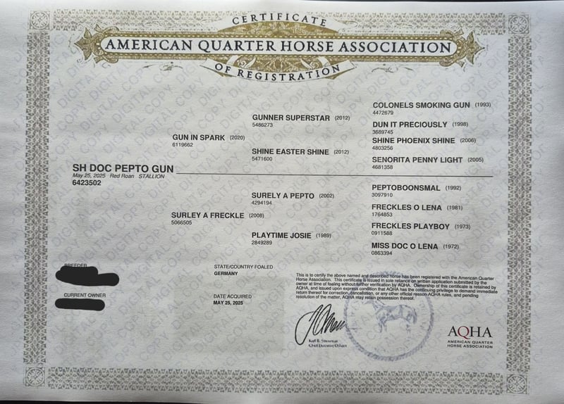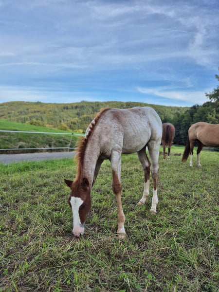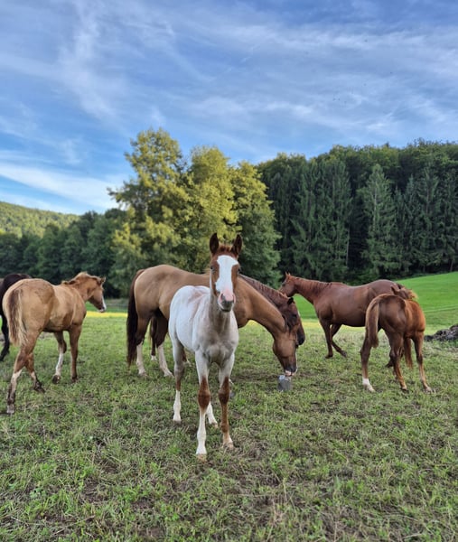 Fine colt with blue eyes. Absolute eye-catcher. Top pedigree - suitable for sports and of course also for ambitious leisure riders. Estimated final height 150cm. Learns the basics of foal training until weaning. Grows up healthy on our large Black Forest pastures, in a herd environment. - Stable foundation and strong bones - Good conformation - Calm character - Easy to handle - 5 Panel N/N through the parents - CoR AQHA and DQHA passport applied for **Entering the yard and pastures of the establishment for viewings as well as riding sale horses is always at your own risk! Exclusion of any warranty! We charge €50 for trial rides of our sale horses. This amount will be deducted from the purchase price of a horse.**