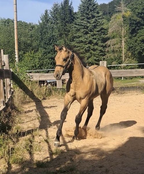 Roosters Bexx On Ice - splendido puledro dunskin Quarter Horse (nato il 25 maggio), con altezza finale prevista di circa 150 cm, possiede tutte le caratteristiche desiderabili in un giovane cavallo: una struttura corretta, compatta e forte, una buona muscolatura e una base sana, che lo rendono un talento polivalente con un grande potenziale. Il piccolo affascinante cresce in modo naturale in un branco con altri puledri ed è maneggiato con cura quotidianamente. Bexx si mostra sempre molto socievole, affettuoso, tranquillo e facile da gestire – un vero tesoro nel quotidiano. Ama le coccole e rimane sempre calmo e amichevole. Al momento della vendita: vaccinato, regolarmente sverminato, conosce il veterinario e il ferratore. Ottimo movimento – ideale per il tempo libero e oltre. Un giovane cavallo con tanto cuore, qualità e potenziale – perfetto per chi cerca un compagno affidabile, talentuoso e senza complicazioni per la vita.