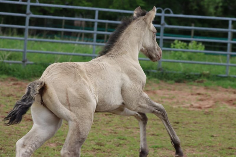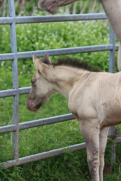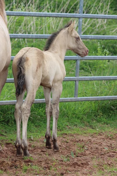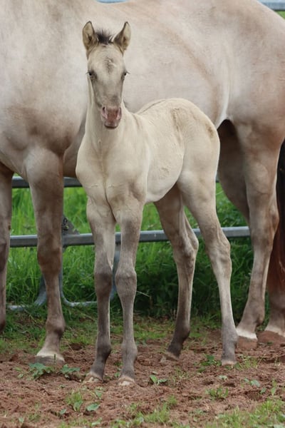CHEYENNES VUDU KING Classic Dun Champagne AQHA Stallion Homozygous Black Born: April 27, 2025 Approximate height: 15.2 hh 7 Panel N/N EE aa Dd CHch