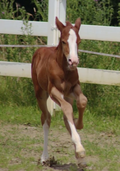 Buitenkans !!! Super geweldig Quarter Horse veulen uit de beste reining bloedlijnen. De moeder is een dochter van Gunnatrashya uit een dochter van Docs Hickory, die al een Limited Open Futurity Kampioen heeft gebracht. De vader is zelf succesvol uitgebracht en is een zoon van Shine Chic Shine uit een dochter van Wimpys Little Step. Een stamboom dus die niets te wensen overlaat! De kleine is mooi gebouwd, met atletische, vlakke bewegingen, wisselt gemakkelijk. Zeker een kijkje waard !!!