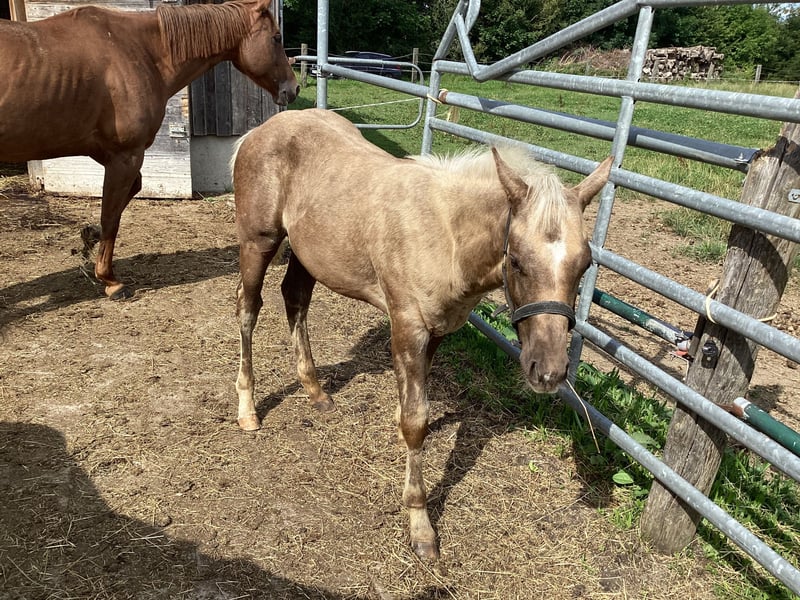 American Quarter Horse Stallion – Palomino, Born 2022 For sale is a stunning American Quarter Horse stallion, born in 2022. The impressive Palomino captivates with its elegant appearance and friendly temperament. Standing at 14.0 hh, he is ideally suited for reining training and competitions. The stallion has a solid basic education in reining and demonstrates great talent and willingness to develop further. His excellent conformation and balanced character make him a reliable partner for ambitious riders. Please feel free to contact me for more information or if you are interested. Viewing and test riding available by appointment.
