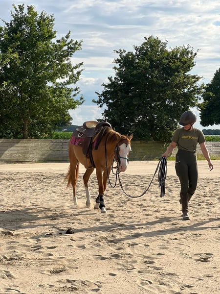 For sale is my Quarter Horse stallion LIL SHOOTIN BUCKAROO “Buck” (Guns R for Shootin x Lil Steppin Chic), born in March 2023. He comes in the rare red dun splash color with two blue eyes and four white legs. Current height: 145 cm NRHA nominated DQHA Foal Show: awarded 1A Premium Foal He has been regularly vaccinated and dewormed. Buck is lightly started under saddle and has extensive groundwork experience. From the very beginning, he has been handled daily and is well accustomed to people. He loads easily, stands perfectly for the farrier, and knows the trails from many walks and a few rides. Character: An absolute sweetheart – even as a stallion, very gentle and easy to handle. He is completely unflappable, truly “bombproof.” He shows the same qualities under saddle: willing, eager to please, and enjoys working. He is used to rider weight, saddle, and lunging in all three gaits, both with and without a rider. His training is ongoing. He grew up in a large herd with both stallions and geldings and is currently turned out with another gelding. Even around mares, his behavior is exceptionally good. Buck shows great potential for Reining and would be a strong prospect for ambitious competitors, but he would also make a reliable partner for leisure riding or could be used as a breeding stallion. More photos and videos available upon request.