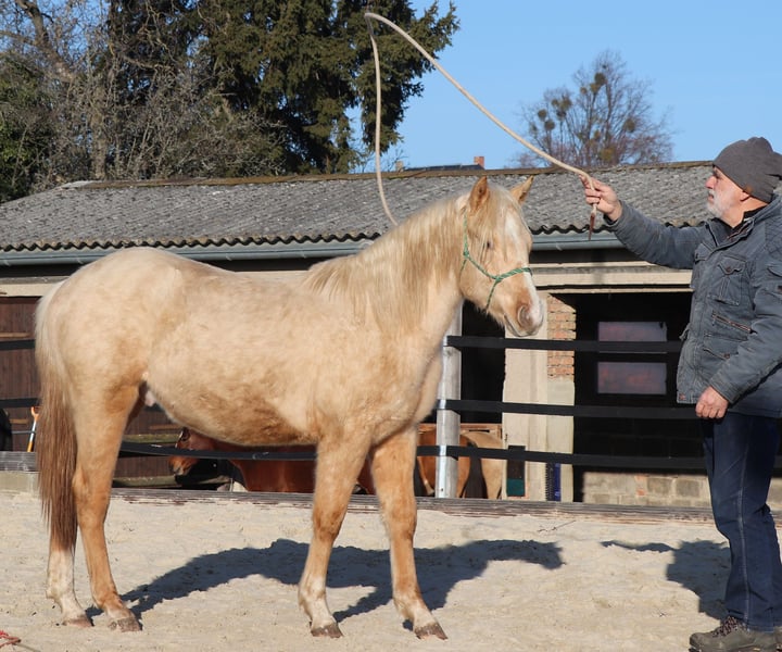 Peppy Doc King Maxen - Dieser 2024 geborene Palomino (Endmaß ca. 148 cm) mit traumhafter weißer Mähne und Schweif ist ein absoluter Eyecatcher - kompakt, korrekt gebaut und mit vielversprechenden Proportionen. Ein Nachwuchspferd, das nicht nur durch seine Optik, sondern auch durch seinen tollen Charakter überzeugt. Er ist menschenbezogen, freundlich, aufmerksam und lernwillig. Im täglichen Umgang zeigt er sich artig, entspannt und unkompliziert. Herausforderungen begegnet er mit Mut und Neugier und lernt schnell. Schon jetzt lässt er sich problemlos verladen und geht ruhig und gelassen an der Hand ins Gelände. Der Hengst wächst gesund und robust im Offenstall in gemischter Herde auf und wird liebevoll und mit viel Sachverstand an seine Aufgaben als Reitpferd herangeführt - nach den Prinzipien des Natural Horsemanship, Schritt für Schritt und ohne Zeitdruck. Die Farbgenetik (e/e, A/a, CH/ch) macht ihn nicht nur farblich besonders interessant, sondern eröffnet auch züchterisch Potenzial. Peppy ist altersgemäß geimpft und regelmäßig entwurmt. Seine Abstammung lässt keine Wünsche offen: Top Cuttinglinien (Enkel von Peptoboonmal) väterlicherseits treffen auf ausgezeichnete Reiteigenschaften mütterlicherseits - eine ideale Kombination für Sport, Turnier und Freizeit. Der Hengst ist DQHA sowie Regional-Futurity startberechtigt und bringt alles mit, um in Zukunft ein vielseitig einsetzbares Reitpferd mit Charme, Talent und Herz zu werden.