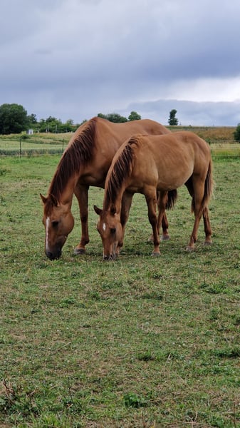 À vendre, un prometteur étalon American Quarter Horse, né en avril 2024. Ce jeune étalon coloré Red Dun, avec des zébrures sur les antérieurs, impressionne déjà par ses muscles compacts. Sa taille au garrot devrait avoisiner les 150 cm, ce qui en fait un partenaire polyvalent pour le Western Allround. Sa demi-sœur, âgée de 9 ans, se distingue par son tempérament sociable et ses compétences polyvalentes, que ce soit en manœuvres de reining avancées, en trail, ranch riding ou en randonnée, elle constitue une excellente partenaire de loisir. Nous sommes convaincus que "OLENAS DUN IS A GUN", alias Rudi, suivra également une évolution aussi prometteuse. Il séduit non seulement par sa couleur remarquable, mais aussi par son caractère amical. Idéal pour les cavaliers ambitieux à la recherche d’un partenaire talentueux pour diverses disciplines western. Rudi sera disponible fin novembre et pourra rester avec nous pour sa croissance. Les deux parents sont visibles sur place. Pour toute question ou information complémentaire, n’hésitez pas à nous contacter.