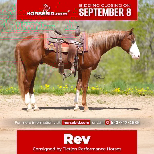 ♦️ 𝐭𝐡𝐞 𝐒𝐞𝐩𝐭𝐞𝐦𝐛𝐞𝐫 𝑺𝒆𝒍𝒆𝒄𝒕 ♦️ Happening now thru MONDAY | SEPTEMBER 8th - Available EXCLUSIVELY on HorseBid's website! For more details and to register visit: www.Horsebid.com CONSIGNOR CONTACT: Tietjen Performance Horses 563-212-4686 LOCATION: Bellevue, IA BREED: Quarter Horse REGISTERED: Yes REGISTERED NAME: RevolutionaryDreamer COLOR: Sorrel HEIGHT: 15 AGE: 2 GENDER: Stallion Are you searching for your next champion? Look no further. We are proud to present Revolutionarydreamer, a 15hh, 2-year-old sorrel stallion with the pedigree, athleticism, and mind to succeed in the show pen. Rev's genetics are the culmination of greatness. His sire, Chic Dreamin, is a legend in the arena with LTE exceeding $262,000. As an AQHA World Champion and NRBC Open Derby Champion, Chic Dreamin has a proven track record of producing talented and trainable offspring. The winning legacy continues with his dam's side. Rev's dam is an own daughter of the legendary Inferno 66, an NRHA $4 Million Sire with LTE in excess of $210,000. This powerful combination of bloodlines ensures Rev has the proven genetics to become a champion in his own right. We started him under saddle and have been diligently progressing and educating him. His "tons of chrome" and striking looks are matched by his incredible trainability and kind mind, making him a joy to work with. He is an ideal prospect for a variety of disciplines, including Ranch Riding, Ranch Trail, Reining, Reining Cow Horse and Roping. His natural athleticism, coupled with the foundation we have provided, sets him up for a successful and versatile career. Don't miss this opportunity to own a horse with the bloodlines of champions and the talent to forge his own legacy. Whether you're looking for a top-tier show prospect or a future breeding stallion, Rev is the horse you've been searching for. Give us a call, Terry & Kate Tietjen 563-212-4686, to learn more about Rev and schedule a visit!