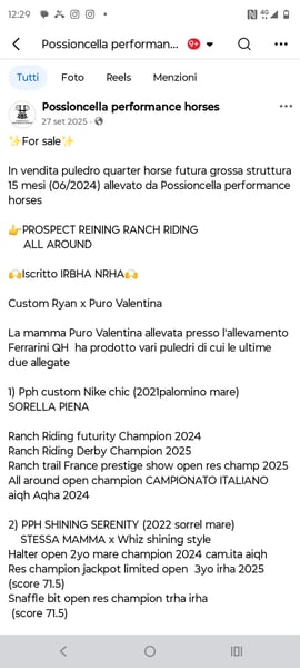 ✨For Sale✨ Futuristic Quarter Horse foal with a large build, 15 months old (born June 2024), bred by Possioncella Performance Horses. 👉 Prospect for Reining, Ranch Riding, All-Around disciplines 🙌 Registered with IRBHA and NRHA 🙌 Custom Ryan x Puro Valentina The dam, Puro Valentina, bred at the Ferrarini QH farm, has produced several foals, including the two attached below: 1) PPH Custom Nike Chic (2021, Palomino mare) – Full sister - Ranch Riding Futurity Champion 2024 - Ranch Riding Derby Champion 2025 - Ranch Trail France Prestige Show Open Reserve Champion 2025 - All-Around Open Champion at the Italian AQHA Championship 2024 2) PPH Shining Serenity (2022, Sorrel mare) – Same dam x Whiz Shining Style - Halter Open 2-Year-Old Mare Champion 2024, Italian AQHA - Res Champion Jackpot Limited Open 3-Year-Olds IRHA 2025 (score 71.5) - Snaffle Bit Open Reserve Champion TRHA IRHA (score 71.5) 📲 For more information, contact via WhatsApp: +39 339 5496979