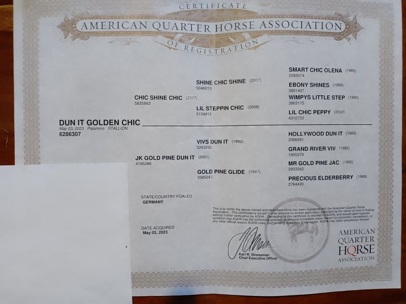 2-year-old, super harmoniously built stallion for sale. He presents himself with a good back line, straight and strong legs, and well-angled shoulders. Due to his size (currently 1.38m), he only started in August; he is expected to reach about 1.43m and will be wide. He already shows himself to be very balanced, cooperative, and super easy to handle. He can be tied up alone anywhere, is familiar with the farrier and trailer. Walking alone without other horses is also not a problem; he is very fearless and cool in all situations. His mother is a granddaughter of HDI who herself was shown very successfully in the Non-Pro and Youth categories. Her offspring have already achieved many victories in placements in Working Cowhorse, as well as in Reining and other disciplines. Her most well-known son is probably TJ Sharp Dressed Man (by Sharp Dressed Shiner), who has already won many titles under his rider Martin Schemuth. His father, Shic Shine Shic, is a descendant of Shine Shic Shine and was also shown successfully in the Open category in Reining. Inquiries will only be answered by phone! Location 56288 Hunsrück Tel. 0151 22343117