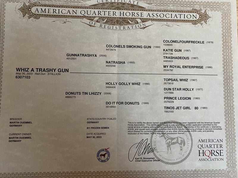 Murphy (Whiz A Trashy Gun, born May 30, 2023) is a well-built, typy, stunning Red Dun stallion with excellent performance genetics—his pedigree combines proven top lines from the reining sport. Murphy impresses with: - Natural athleticism and a powerful hindquarters - Good balance and high-quality movement - Dynamic gaits - Strong willingness to learn and motivation - Friendly, people-oriented nature In addition to reining, his movement quality and rideability also make him well-suited for ranch classes, especially Ranch Riding. In daily handling, he proves to be uncomplicated, sensitive, and cooperative. A young stallion with versatile potential for sport and leisure. We look forward to hearing from you if you are seriously interested.