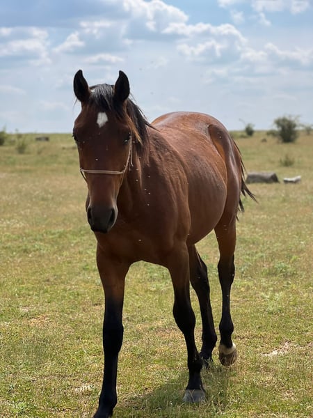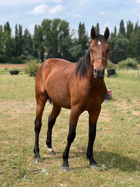 Bob Potro cruzado de Quarter Horse (cuarto de milla) con Lusitano Castaño 155 cm altura actual en crecimiento Nacido en 2022 (2 años) Entero Potrazo de campo con grandes origenes, ideal para empezar un proyecto que tenga un futuro prometedor, con paso grande y serio y un galope resondo y completo. Cualquier consulta llama al 696613777