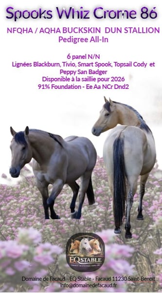 Nom : Spooks Whiz Crome 86 Numéro AQHA : Reg 6325811 Tests génétiques : 6 Panels Clear N/N : GBED, HYPP, MYHM, HERDA , MH, PSSM1 Race : Quarter Horse AQHA / NFQHA 91% Foundation Couleur : Buckskin Dun - E/e, A/a, n/Cr, D/nd2 Dunskin